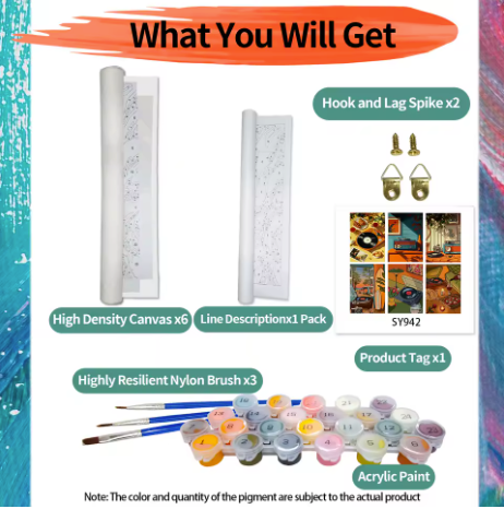 In het pakketje zit alles wat je nodig hebt om aan de slag te gaan met jouw kunswerk!